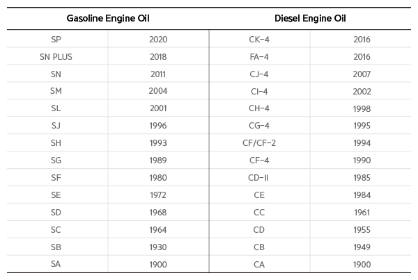 The American Petroleum Institute (API) officially acknowledged standards for the quality of engine oil that suits each engine following the proliferation of automobiles in the 1900s and express them in signs which are classified largely into gasoline and diesel. Gasoline is marked in S (Service Category) and Diesel is marked in C (Commercial Category), and then added by A, B, C, D, and so on to distinguish their grades. Since the latest engine models are more required to work in harsher environment under tighter regulations, they satisfy more strict regulations than previous grades.